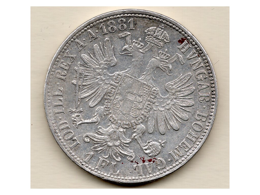Tento stříbrný zlatník (1 florin) z roku 1881 byl ražen bez značky mincovny (b.zn.) během vlády císaře Františka Josefa I., v období tzv. spolkové měny, kdy byl florin (gulden) hlavní měnovou jednotkou habsburské monarchie. Averz nese portrét panovníka s vavřínovým věncem a legendou FRANC IOS I D G AVSTRIAE IMPERATOR, zatímco reverz zobrazuje korunovaného dvouhlavého orla s erbem a textem označujícím císařské tituly, rok ražby a nominální hodnotu 1 FL.