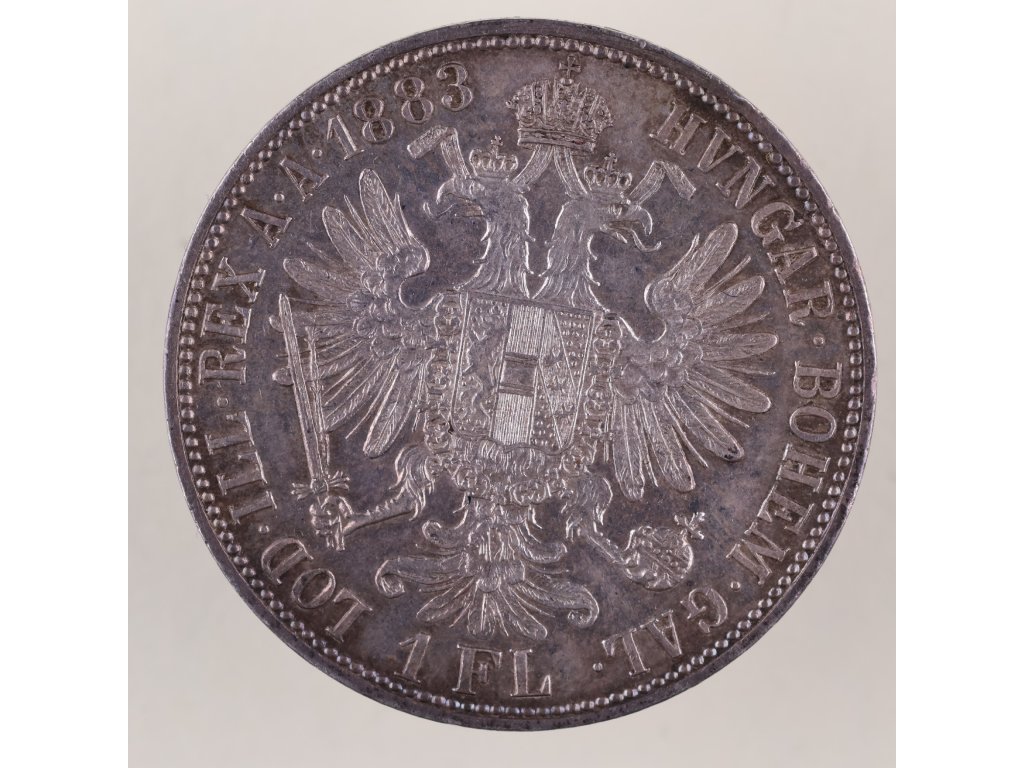 Tento stříbrný zlatník (1 florin) z roku 1883 byl ražen bez značky mincovny (b.zn.) během vlády císaře Františka Josefa I., v období tzv. spolkové měny, kdy byl florin (gulden) hlavní měnovou jednotkou habsburské monarchie. Averz nese portrét panovníka s vavřínovým věncem a legendou FRANC IOS I D G AVSTRIAE IMPERATOR, zatímco reverz zobrazuje korunovaného dvouhlavého orla s erbem a textem označujícím císařské tituly, rok ražby a nominální hodnotu 1 FL.