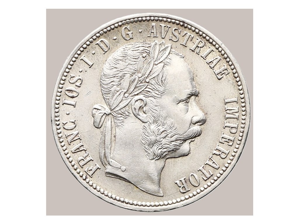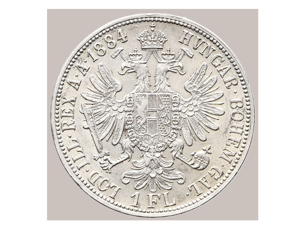 Tento stříbrný zlatník (1 florin) z roku 1884 byl ražen bez značky mincovny (b.zn.) během vlády císaře Františka Josefa I., v období tzv. spolkové měny, kdy byl florin (gulden) hlavní měnovou jednotkou habsburské monarchie. Averz nese portrét panovníka s vavřínovým věncem a legendou FRANC IOS I D G AVSTRIAE IMPERATOR, zatímco reverz zobrazuje korunovaného dvouhlavého orla s erbem a textem označujícím císařské tituly, rok ražby a nominální hodnotu 1 FL.