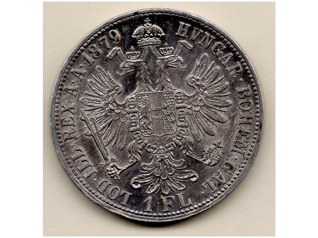 Tento stříbrný zlatník (1 florin) z roku 1879 byl ražen bez značky mincovny (b.zn.) během vlády císaře Františka Josefa I., v období tzv. spolkové měny, kdy byl florin (gulden) hlavní měnovou jednotkou habsburské monarchie. Averz nese portrét panovníka s vavřínovým věncem a legendou FRANC IOS I D G AVSTRIAE IMPERATOR, zatímco reverz zobrazuje korunovaného dvouhlavého orla s erbem a textem označujícím císařské tituly, rok ražby a nominální hodnotu 1 FL.