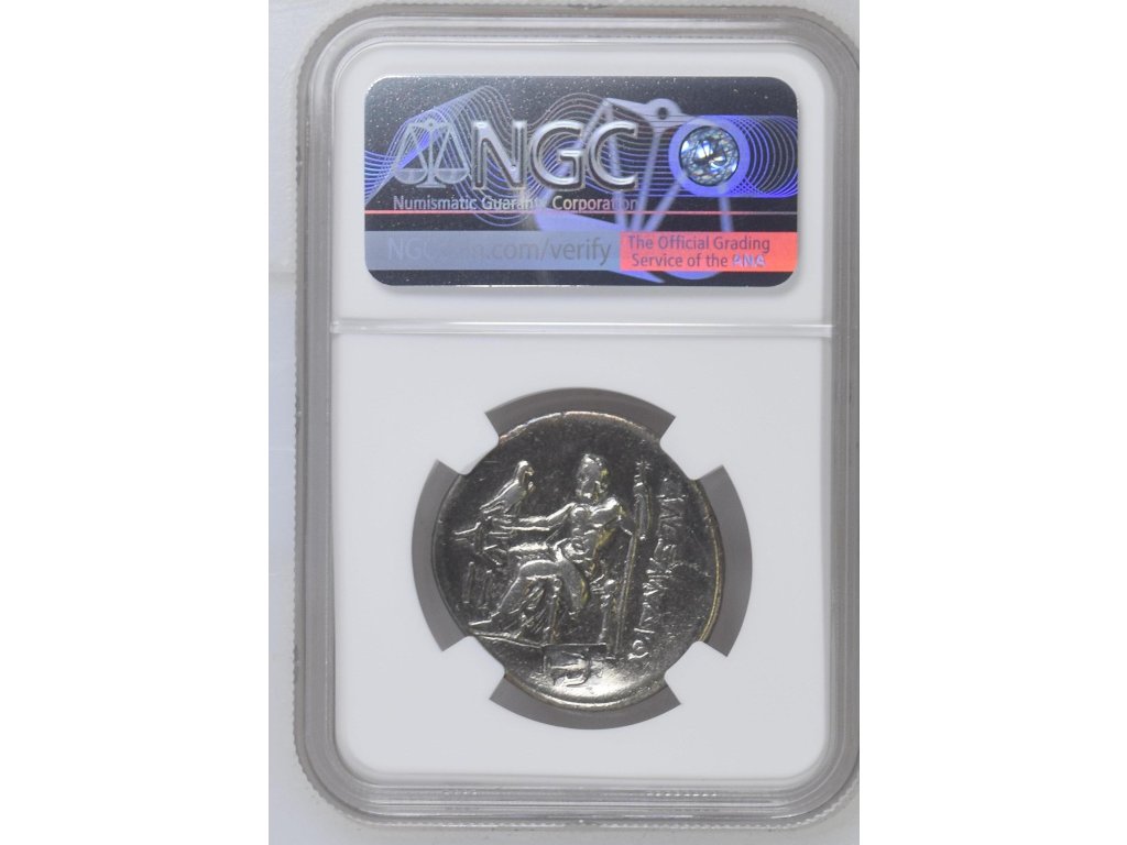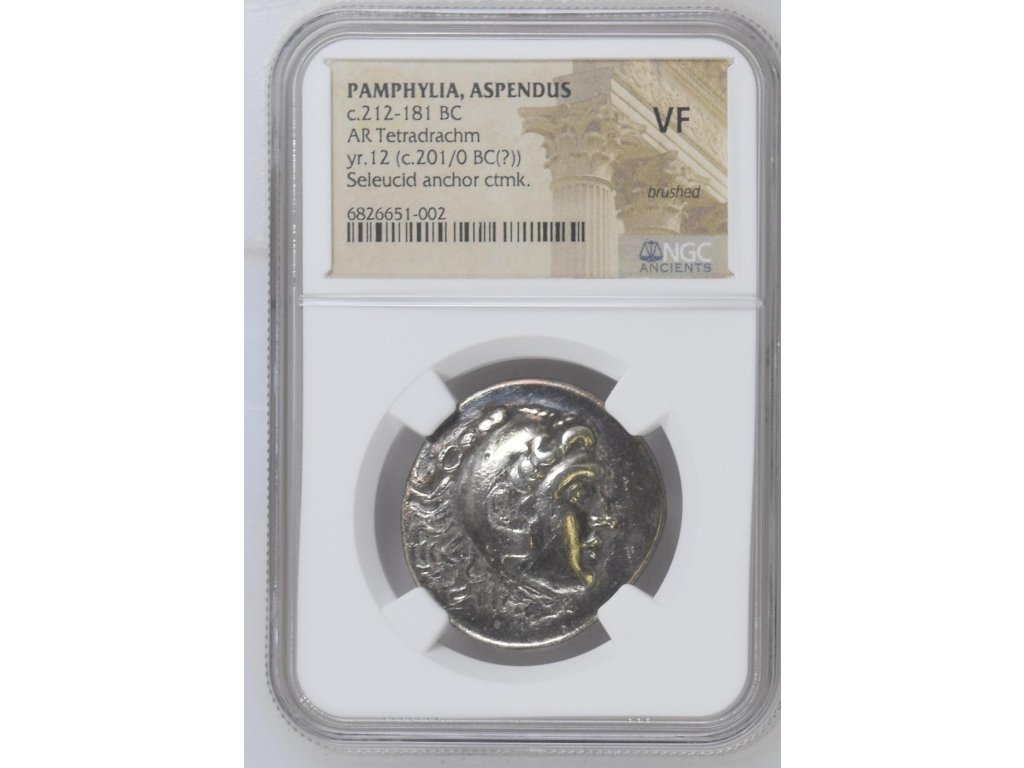 Alexandr III. Veliký (336–323 př. n. l.) vytvořil rozsáhlou říši a jeho mincovní typy se staly vzorem pro celé helénistické období. I po jeho smrti byly v mnoha mincovnách nadále raženy mince s jeho jménem, které symbolizovalo legitimitu a kontinuitu moci. Tato tetradrachma pochází z maloasijského města Aspendos v oblasti Pamfýlie a byla vyražena přibližně mezi lety 212–181 př. n. l.