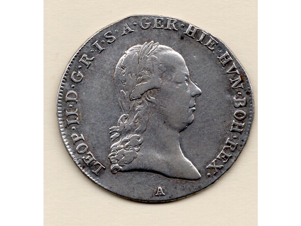 Tato čtvrtina kronenthaleru z roku 1792 byla ražena ve vídeňské mincovně za vlády císaře Leopolda II., syna Marie Terezie. Leopoldův krátký, ale intenzivní panovnický úřad (1790–1792) následoval po reformách jeho bratra Josefa II. a odrážel snahu o stabilizaci říše během revolučního napětí v Evropě. Mince nese na averzu panovníkův portrét s tituly zahrnujícími mimo jiné krále českého, uherského a jeruzalémského.