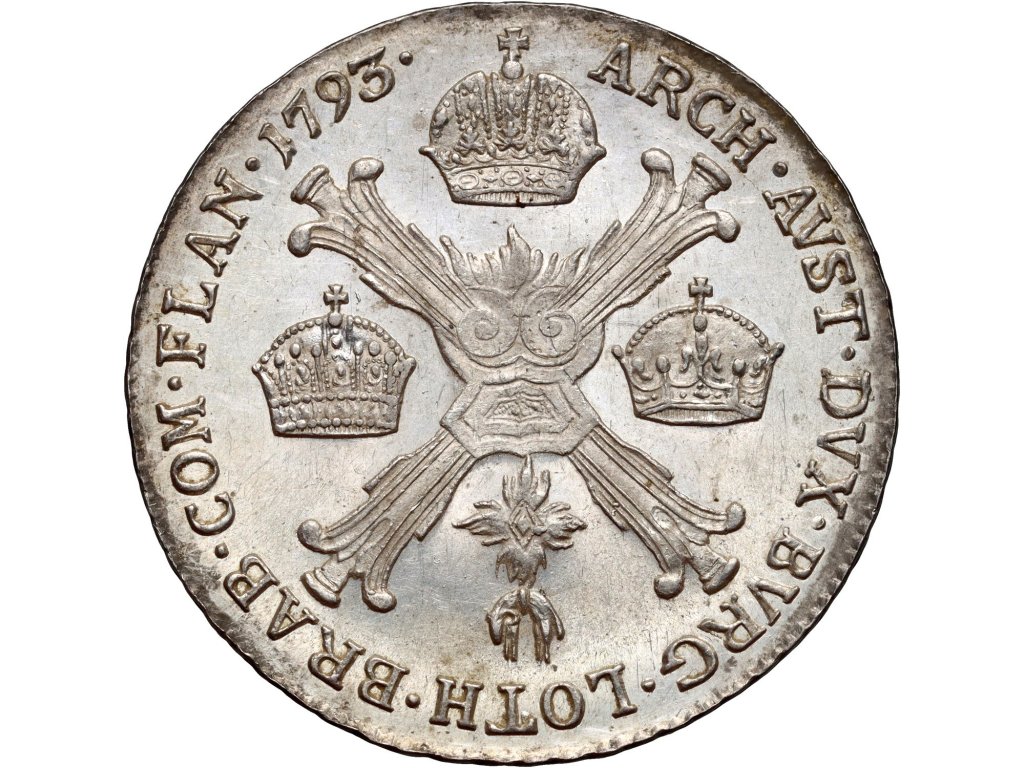 Tato čtvrtina Kronenthaleru byla ražena v roce 1793 v kremnické mincovně (značka B) za vlády císaře Františka II., posledního císaře Svaté říše římské. Averz mince nese portrét císaře s věncem a legendu FRANC·II·D·G·R·I·S·A·GER·HIE·HVN·BOH·REX, která odkazuje na jeho tituly jako římského císaře, uherského a českého krále. Reverz znázorňuje složitý heraldický motiv s třemi korunami, plameny a insigniemi Řádu zlatého rouna, obklopený nápisem ARCH·AVST·DVX·BURG·LOTH·BRAB·COM·FLAN·1793. Mince byla ražena ze stříbra o ryzosti 0,873, s hmotností cca 7,36 g. Výjimečně ostré detaily a typický motiv Habsburských Nizozemí z ní dělají oblíbený exemplář pro specializované sběratele rakousko-nizozemských ražeb. Nese všechny znaky soudobé propagandy moci a legitimity dynastie Habsburků.
