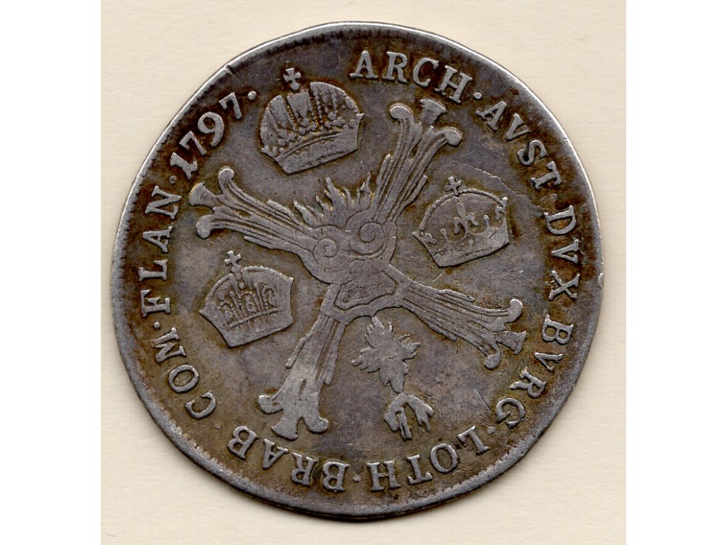Tato čtvrtina Kronenthaleru byla ražena v roce 1797 v kremnické mincovně (značka B) za vlády císaře Františka II., posledního císaře Svaté říše římské. Averz mince nese portrét císaře s věncem a legendu FRANC·II·D·G·R·I·S·A·GER·HIE·HVN·BOH·REX, která odkazuje na jeho tituly jako římského císaře, uherského a českého krále. Reverz znázorňuje složitý heraldický motiv s třemi korunami, plameny a insigniemi Řádu zlatého rouna, obklopený nápisem ARCH·AVST·DVX·BURG·LOTH·BRAB·COM·FLAN·1797. Mince byla ražena ze stříbra o ryzosti 0,873, s hmotností cca 7,08 g.
