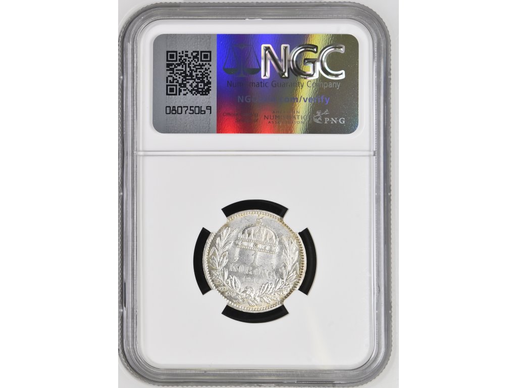 Mince byla ražena v Kremnici (KB) ze stříbra a nese letopočet 1915. Přestože některé exempláře pocházejí z pozdějších let jako tzv. novoražby, tento kus je certifikován společností NGC v hodnocení MS 62, což potvrzuje jeho vysokou zachovalost a autenticitu. Certifikace NGC zaručuje odborné posouzení pravosti a stavu mince, což zvyšuje její důvěryhodnost a sběratelskou hodnotu.