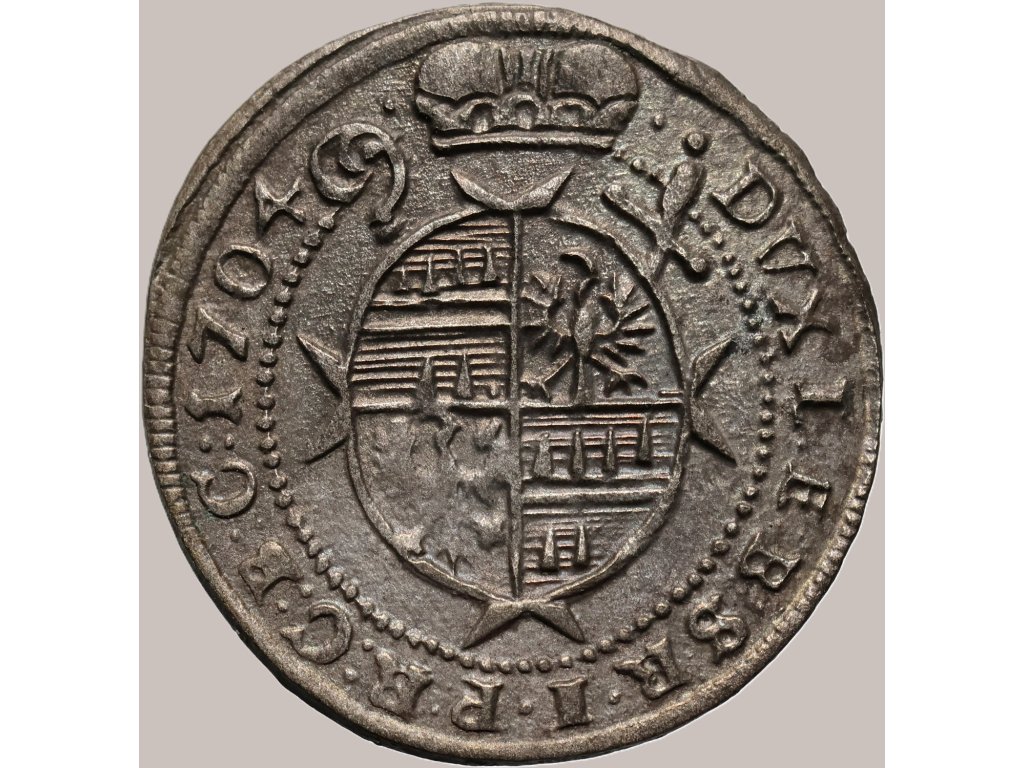 Tento krajcar z roku 1704 byl ražen v olomoucké mincovně a nese typické znaky tehdejší barokní ražby. Averz zobrazuje portrét biskupa s jeho titulem „CAROLVS D.G. EPVS. OLOMVCENSIS“, zatímco reverz nese korunovaný znak olomouckého biskupství. Mincovna v Olomouci byla jedním z mála center ražby církevních mincí na území českých zemí a její produkce dnes představuje cenné historické svědectví o finanční i duchovní moci moravské církevní provincie.