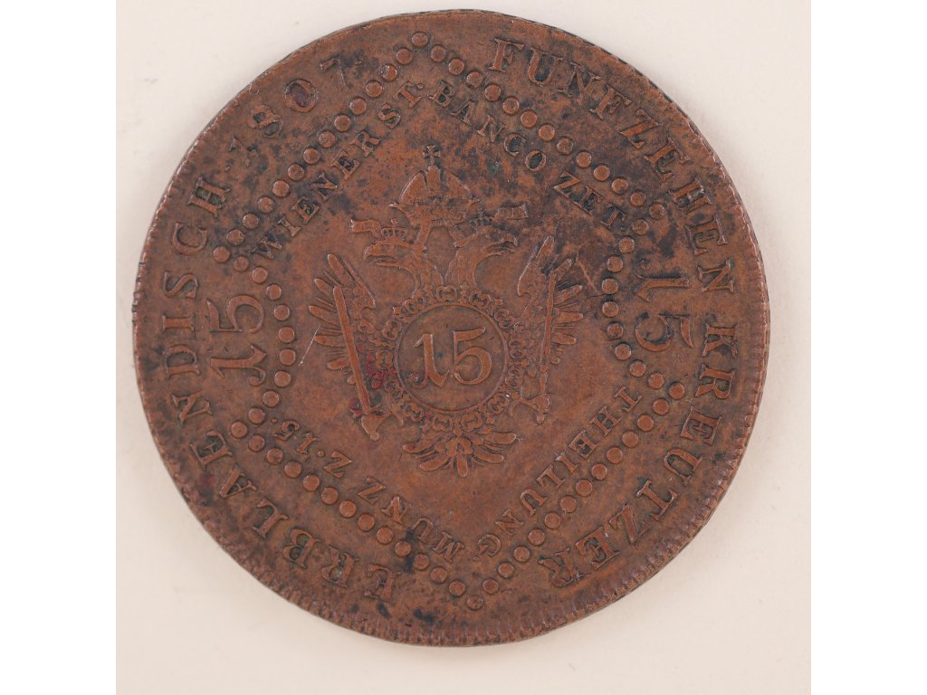 Mince Rakouského císařství o nominální hodnotě 15 krejcarů byla ražena v roce 1807 za vlády císaře Františka I. Rakouského (1804–1835). Tento panovník, původně František II. jako poslední císař Svaté říše římské, se po jejím zániku roku 1806 prohlásil prvním císařem Rakouska. Mince z tohoto období proto představují jeden z prvních oficiálních emisních typů nově vzniklého císařství.