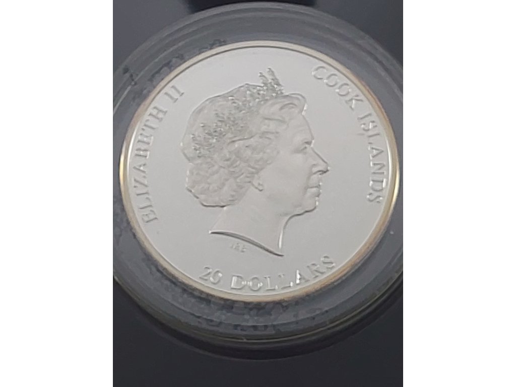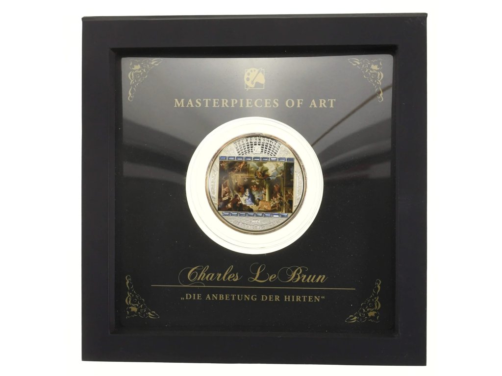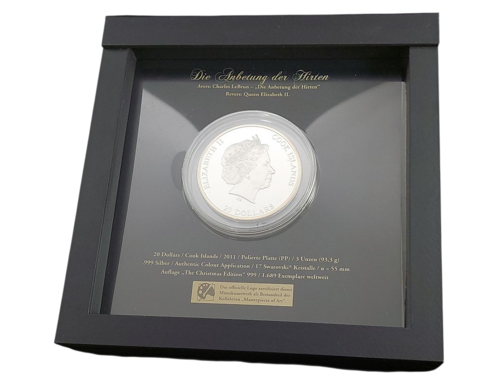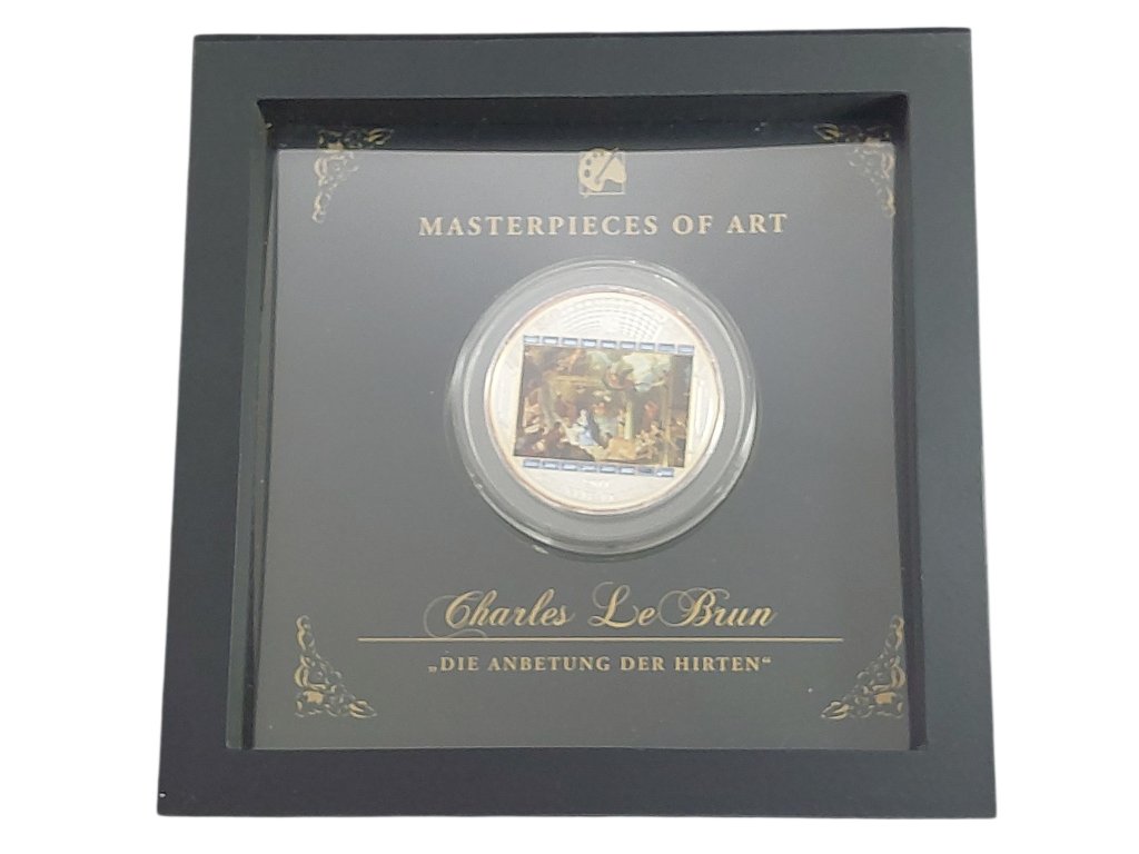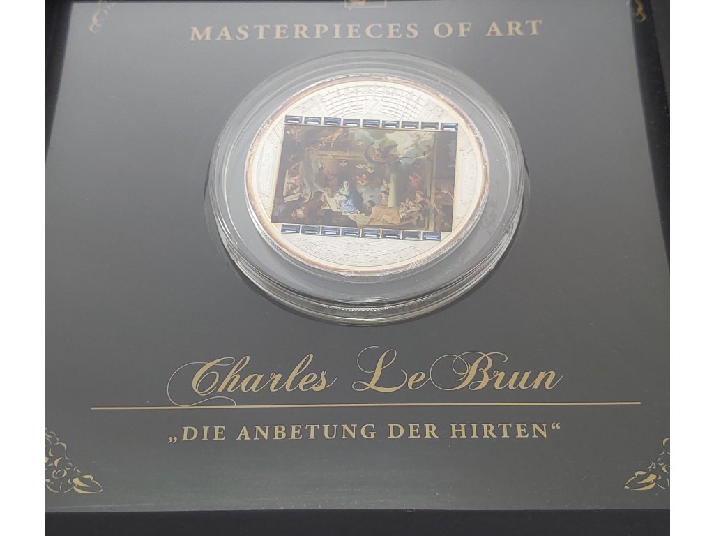 Tato impozantní pamětní mince z kolekce Masterpieces of Art připomíná barokní dílo „Die Anbetung der Hirten“ – Klanění pastýřů – od slavného francouzského malíře Charlese Le Bruna, dvorního umělce Ludvíka XIV. Mince je ražena pro Cookovy ostrovy a vyobrazena je na ní věrná, kolorovaná reprodukce malby z roku 1689, zasazená do precizně rytého pozadí inspirovaného architekturou chrámu.