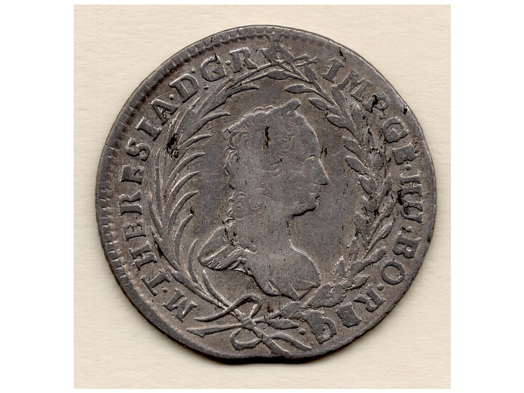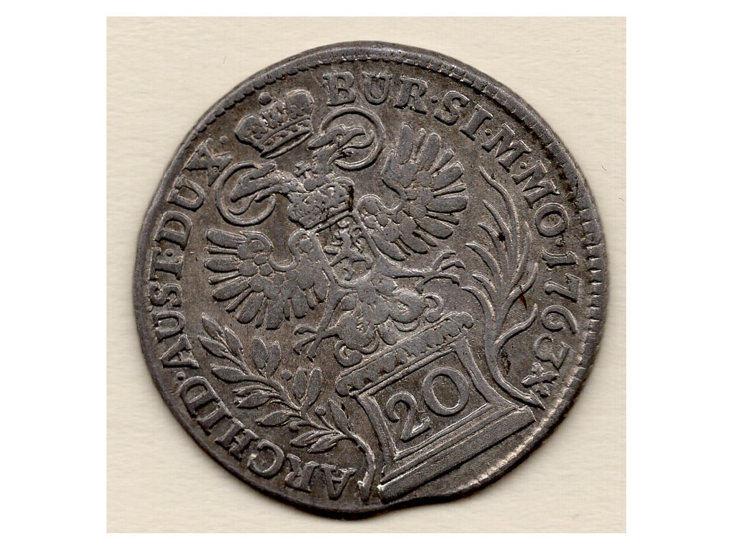 Tato historická mince o nominální hodnotě 20 krejcarů pochází z doby vlády Marie Terezie (1740–1780), jedné z nejvýznamnějších panovnic habsburské dynastie. Byla ražena v roce 1763 v Praze, tedy na území tehdejšího Českého království, které bylo integrální součástí habsburské monarchie.