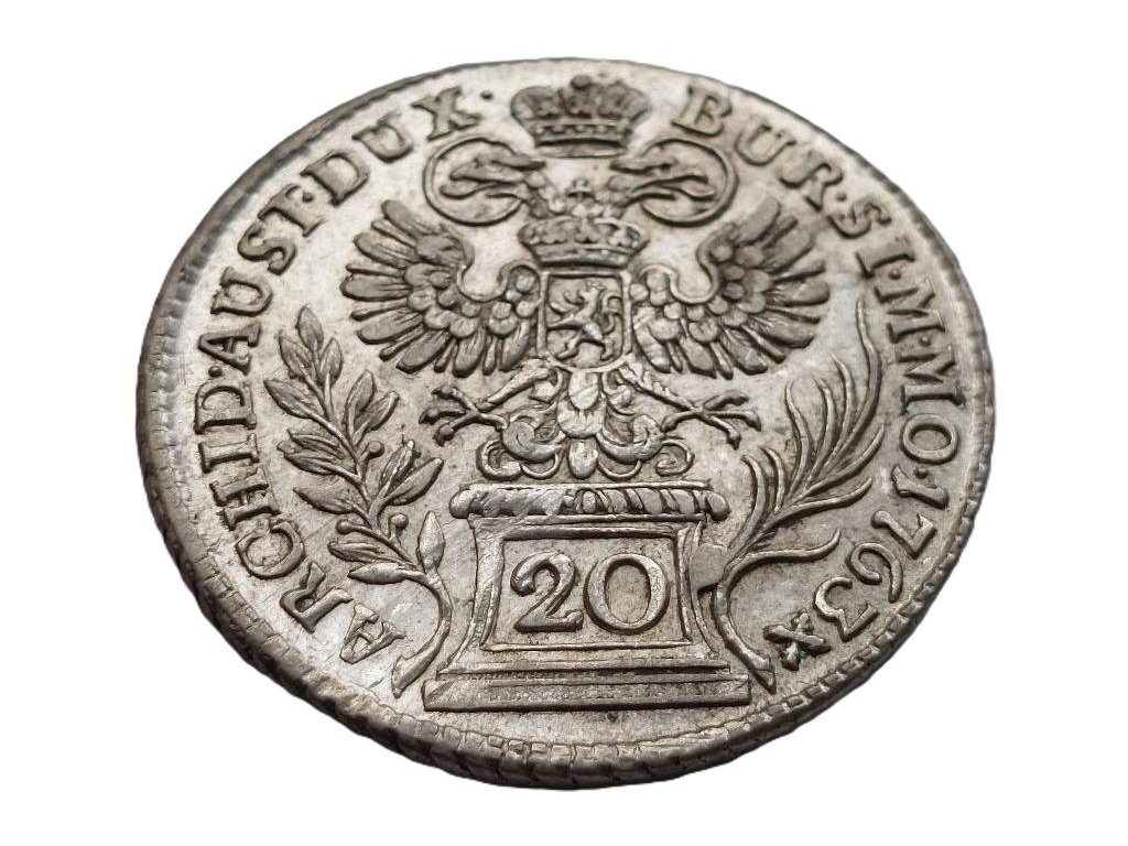 Tato historická mince o nominální hodnotě 20 krejcarů pochází z doby vlády Marie Terezie (1740–1780), jedné z nejvýznamnějších panovnic habsburské dynastie. Byla ražena v roce 1763 v Praze, tedy na území tehdejšího Českého království, které bylo integrální součástí habsburské monarchie.