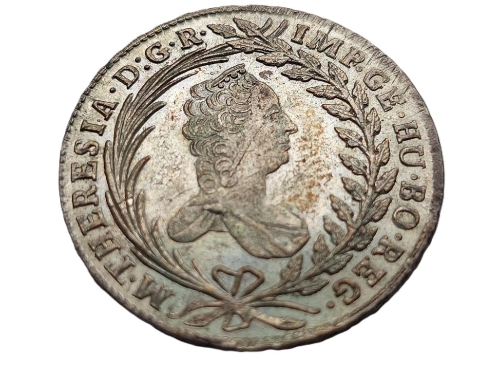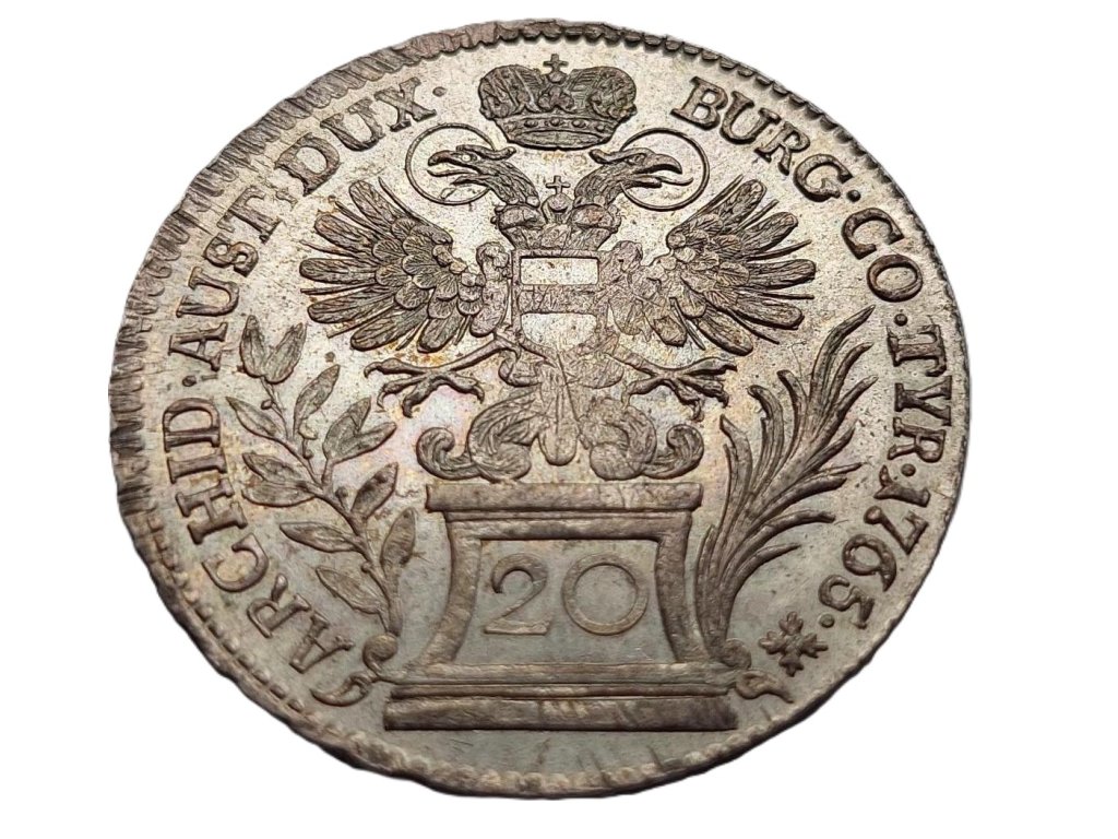 Tento stříbrný 20 krejcar z roku 1765 byl vyražen v období vlády Marie Terezie (1740–1780), jedné z nejvýznamnějších panovnic habsburské monarchie. Jedná se o měnovou jednotku odpovídající třetině zlatky, která vznikla v rámci tereziánské měnové reformy z roku 1754. Averz mince zobrazuje laureovaný portrét Marie Terezie obrácený doprava, v ověnčeném medailonu, s opisem M. THERESIA D. G. R. IMP. GE. HU. BO. REG.