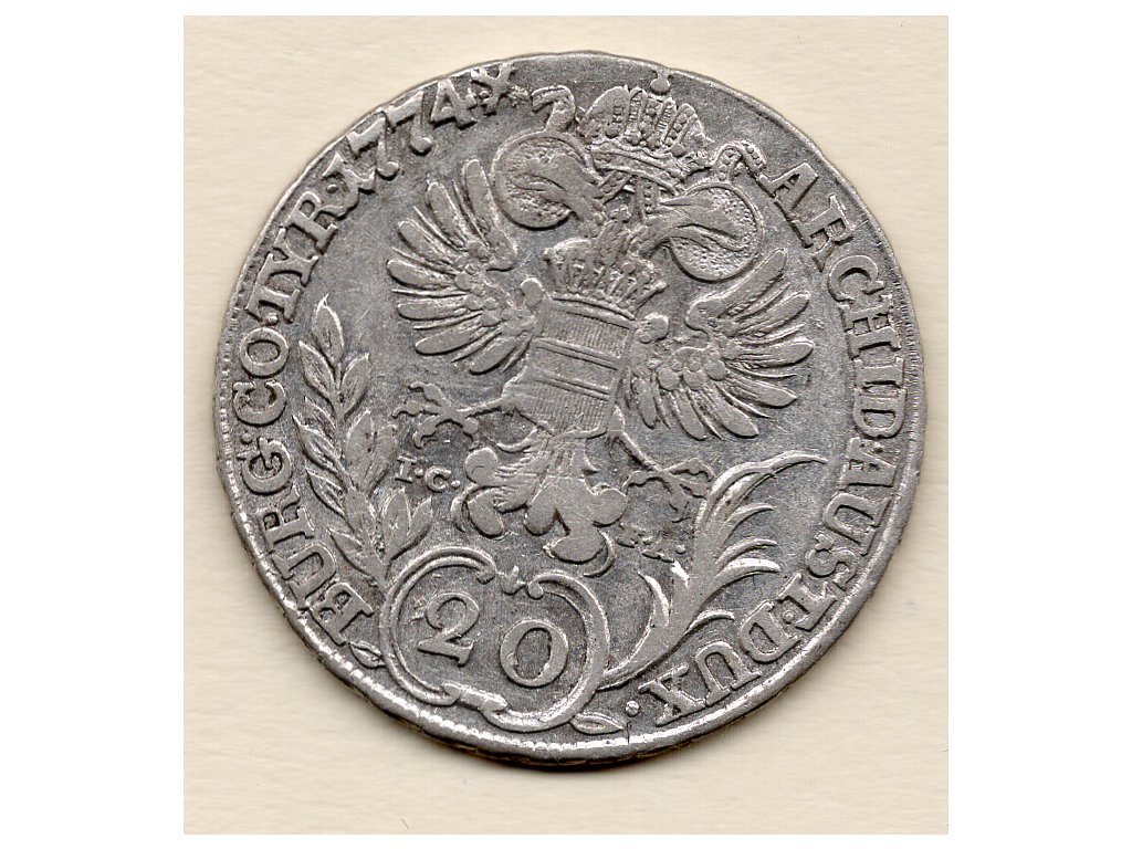 Tento stříbrný 20krejcar byl vyražen roku 1774 za vlády císařovny Marie Terezie (1740–1780), jedné z nejvýznamnějších panovnic habsburské monarchie. Averz nese její portrét s opisem M. THERESIA D. G. R. IMP. HU. BO. REG., který zdůrazňuje její vládu nad rozsáhlými zeměmi střední Evropy. Reverz zobrazuje dvouhlavého orla s korunou a středovým štítem, obklopeného hodnotou „20“ a iniciálami mincmistrů IC–FA, potvrzujícími vídeňskou ražbu.