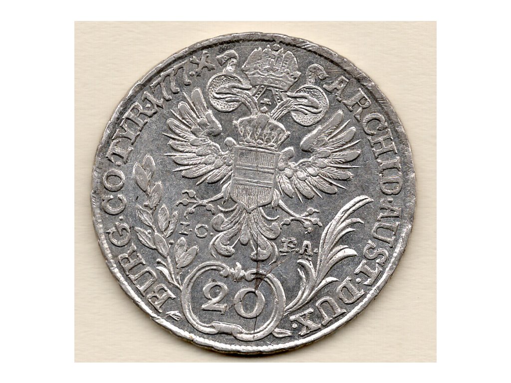 Tento stříbrný 20krejcar byl vyražen roku 1777 za vlády císařovny Marie Terezie (1740–1780), jedné z nejvýznamnějších panovnic habsburské monarchie. Averz nese její portrét s opisem M. THERESIA D. G. R. IMP. HU. BO. REG., který zdůrazňuje její vládu nad rozsáhlými zeměmi střední Evropy. Reverz zobrazuje dvouhlavého orla s korunou a středovým štítem, obklopeného hodnotou „20“ a iniciálami mincmistrů IC–FA, potvrzujícími vídeňskou ražbu.
