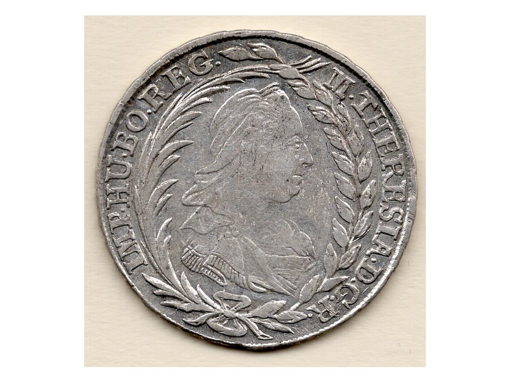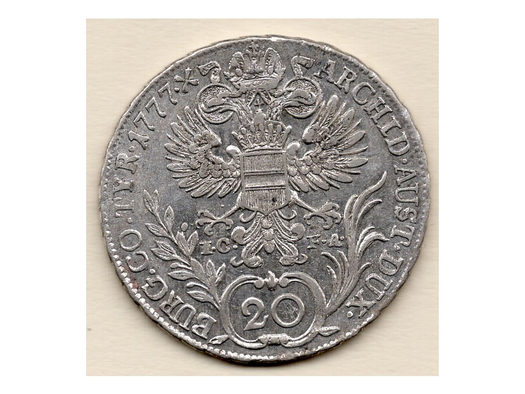 Tento stříbrný 20krejcar byl vyražen roku 1777 za vlády císařovny Marie Terezie (1740–1780), jedné z nejvýznamnějších panovnic habsburské monarchie. Averz nese její portrét s opisem M. THERESIA D. G. R. IMP. HU. BO. REG., který zdůrazňuje její vládu nad rozsáhlými zeměmi střední Evropy. Reverz zobrazuje dvouhlavého orla s korunou a středovým štítem, obklopeného hodnotou „20“ a iniciálami mincmistrů IC–FA, potvrzujícími vídeňskou ražbu.
