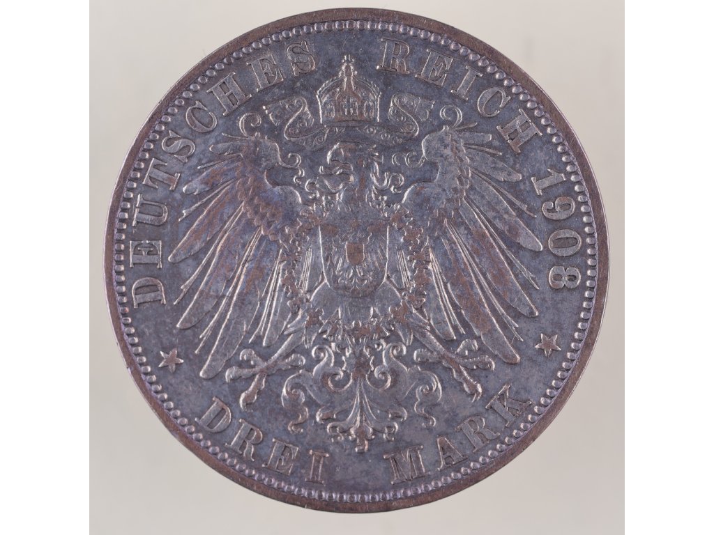 Na lícní straně mince je realisticky ztvárněn profil panovníka s opisem WILHELM II KOENIG VON WUERTTEMBERG, zatímco rub nese císařského orla s korunou a nápisem DEUTSCHES REICH 1908 – DREI MARK. Tento design spojuje regionální hrdost Württemberska s jednotnou imperiální symbolikou Německé říše.