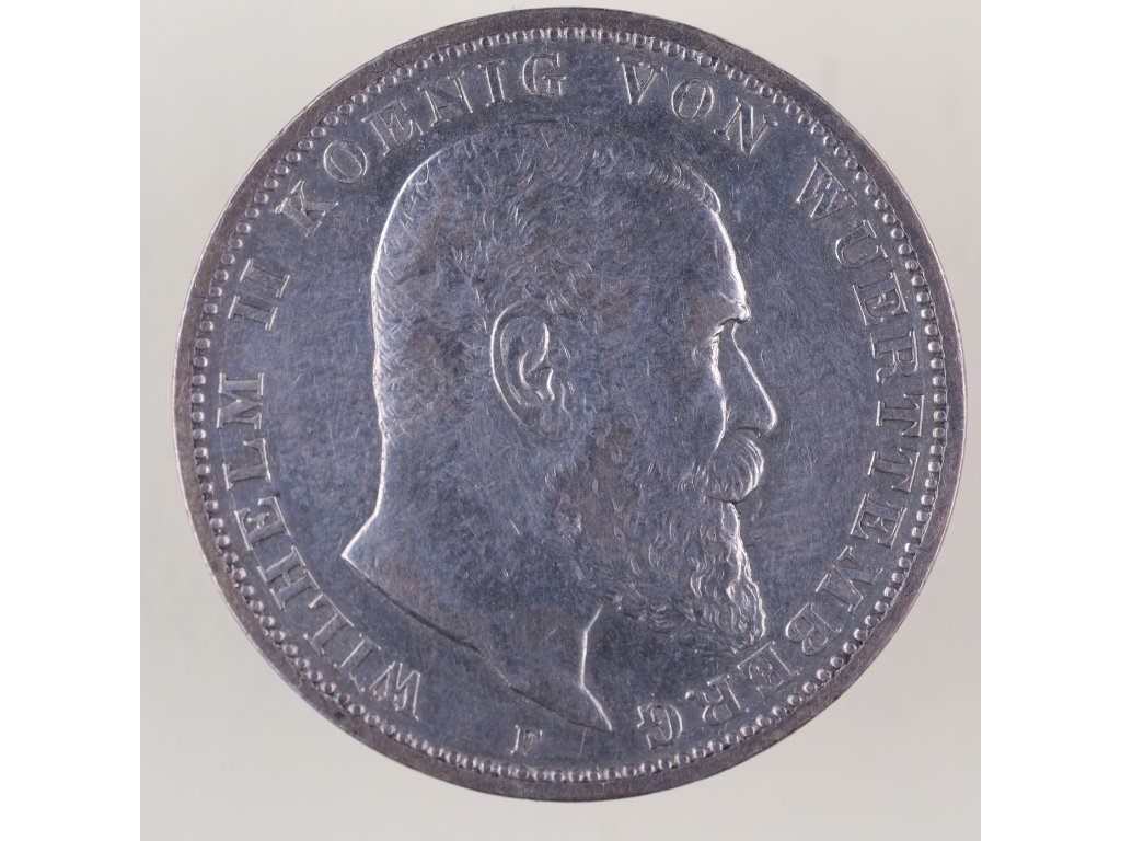 Vilém II. Württemberský (Wilhelm II. von Württemberg) vládl v letech 1891–1918 jako poslední král Württemberska, jednoho z významných států Německé říše. Jeho panování bylo poznamenáno hospodářským rozkvětem, rozvojem průmyslu a infrastruktury, ale také postupným úpadkem monarchického systému v Evropě. Mince s jeho portrétem vznikla v době, kdy Německá říše zažívala vrchol stability a síly před vypuknutím první světové války.