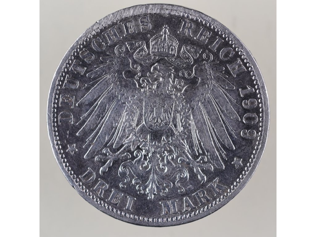 Na lícní straně mince je realisticky ztvárněn profil panovníka s opisem WILHELM II KOENIG VON WUERTTEMBERG, zatímco rub nese císařského orla s korunou a nápisem DEUTSCHES REICH 1909 – DREI MARK. Tento design spojuje regionální hrdost Württemberska s jednotnou imperiální symbolikou Německé říše.