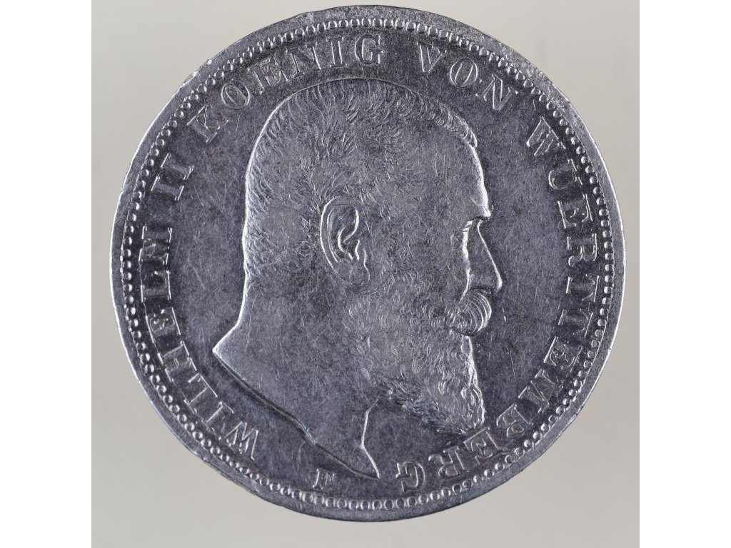 Vilém II. Württemberský (Wilhelm II. von Württemberg) vládl v letech 1891–1918 jako poslední král Württemberska, jednoho z významných států Německé říše. Jeho panování bylo poznamenáno hospodářským rozkvětem, rozvojem průmyslu a infrastruktury, ale také postupným úpadkem monarchického systému v Evropě. Mince s jeho portrétem vznikla v době, kdy Německá říše zažívala vrchol stability a síly před vypuknutím první světové války.