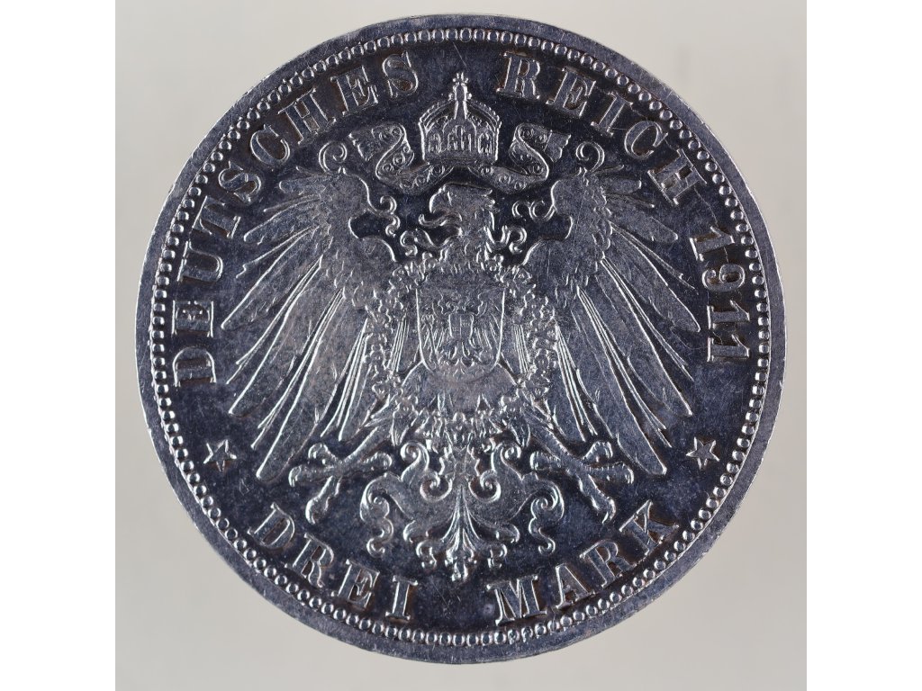 Na lícní straně mince je realisticky ztvárněn profil panovníka s opisem WILHELM II KOENIG VON WUERTTEMBERG, zatímco rub nese císařského orla s korunou a nápisem DEUTSCHES REICH 1911 – DREI MARK. Tento design spojuje regionální hrdost Württemberska s jednotnou imperiální symbolikou Německé říše.
