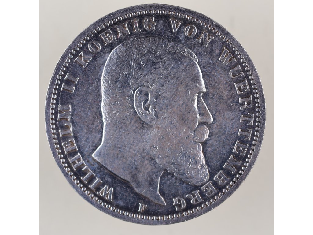 Vilém II. Württemberský (Wilhelm II. von Württemberg) vládl v letech 1891–1918 jako poslední král Württemberska, jednoho z významných států Německé říše. Jeho panování bylo poznamenáno hospodářským rozkvětem, rozvojem průmyslu a infrastruktury, ale také postupným úpadkem monarchického systému v Evropě. Mince s jeho portrétem vznikla v době, kdy Německá říše zažívala vrchol stability a síly před vypuknutím první světové války.