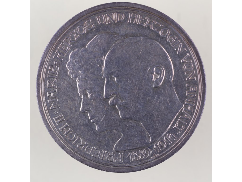 Mince o nominální hodnotě 3 marky byla vyrobena ze stříbra o ryzosti 900/1000, o hmotnosti 16,66 g a průměru 33 mm. Byla ražena v berlínské mincovně (A) a odpovídala standardu říšských pamětních mincí. Na líci je realisticky ztvárněný dvojportrét Fridricha a Marie s opisem “FRIEDRICH • MARIE • HERZOG UND HERZOGIN VON ANHALT • 1889–1914”. Reverz s císařským orlem představuje oficiální heraldický symbol Německého císařství.