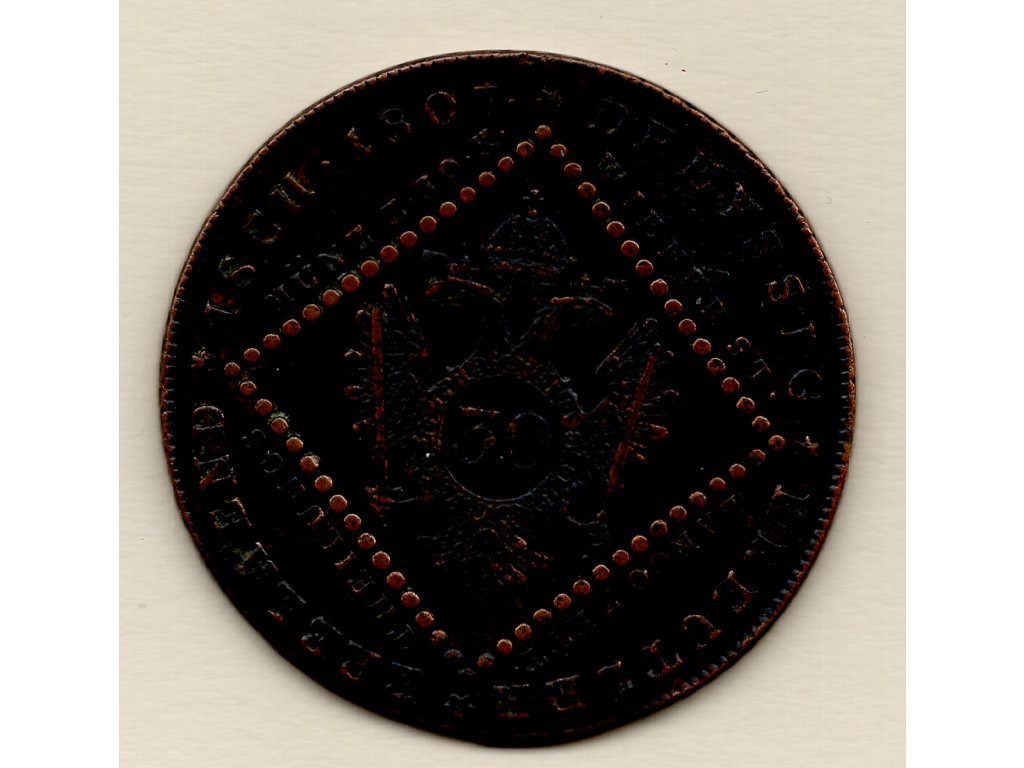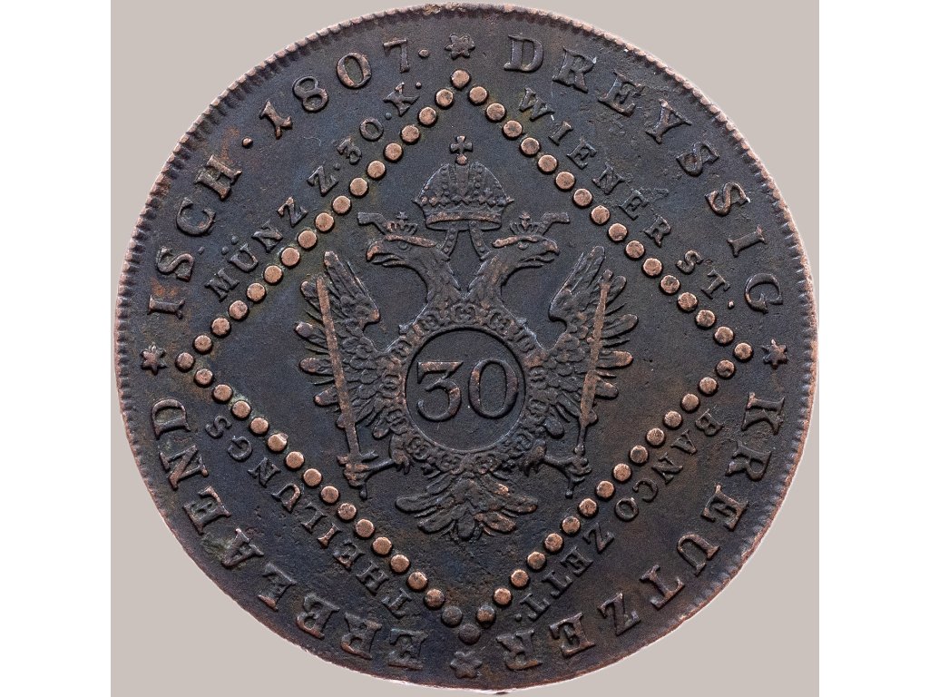 Tato zajímavá měděná mince o nominální hodnotě 30 krejcarů byla ražena v roce 1807 ve Vídni (značka „A“) za vlády Františka I. (II.). Jedná se o typ tzv. „měděného tolaru“, tedy velkoformátové mince z mědi, která měla suplovat stříbrné mince v čase ekonomických potíží po napoleonských válkách.