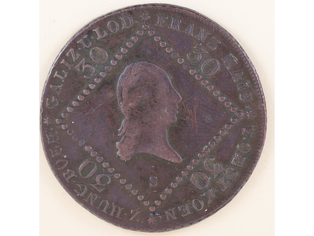 Tato zajímavá měděná mince o nominální hodnotě 30 krejcarů byla ražena v roce 1807 ve Smolniku (značka „S“) za vlády Františka I. (II.). Jedná se o typ tzv. „měděného tolaru“, tedy velkoformátové mince z mědi, která měla suplovat stříbrné mince v čase ekonomických potíží po napoleonských válkách.