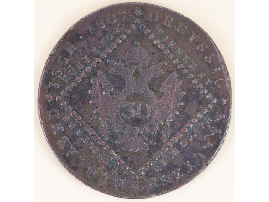 Averz nese portrét císaře s opisem FRANZ KAIS. V. OEST. KOEN. Z. HUNG. BOEH. GALIZ. U. LOD. a číslicemi 30/50 – připomínající paralelní účtování hodnoty mince v krejcarech a systémové váze. Revers zobrazuje dvouhlavého orla s korunou a meči, kolem nápis ERBLAND ISCH 1807 DREYSSIG KREUZER BANCO ZEIT WIENER ST. MÜNZ Z 30 K.