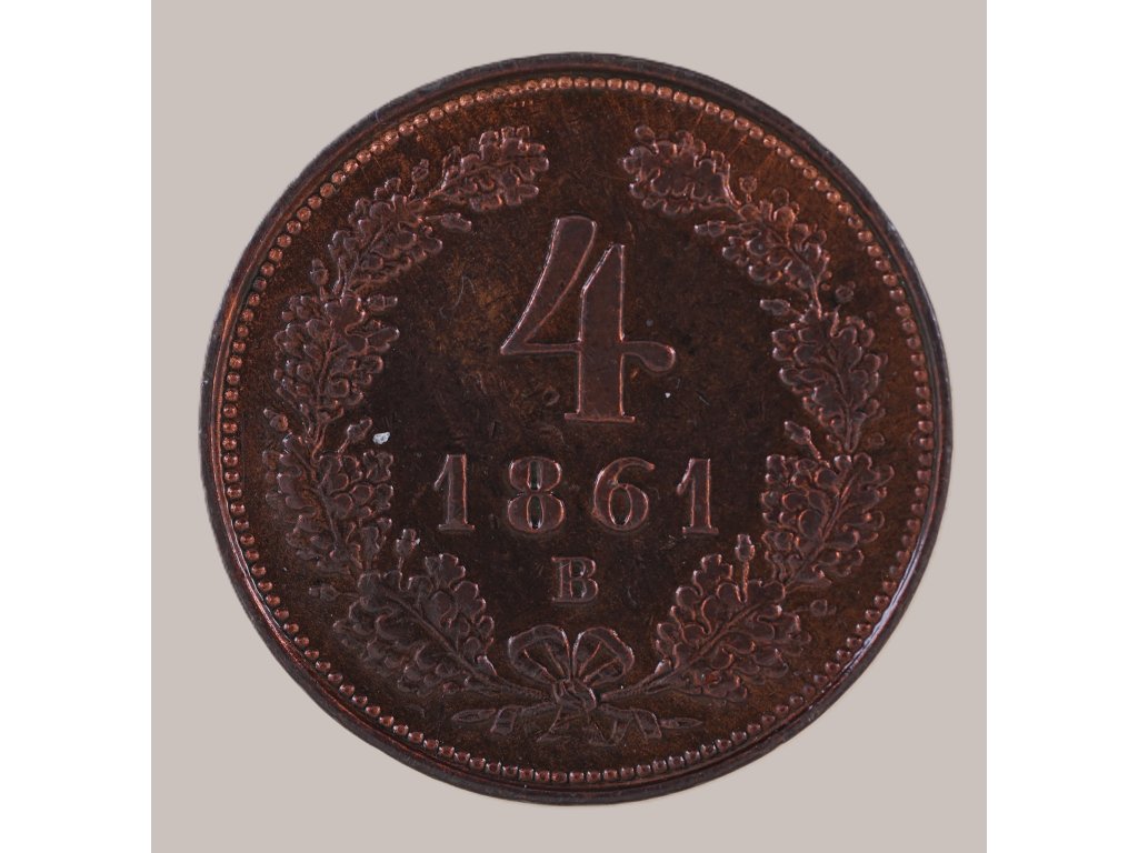 Na lícové straně je zobrazen rakouský dvouhlavý orel s císařskou korunou a štítem Habsbursko-Lotrinské dynastie. Nápis K. K. OESTERREICHISCHE SCHEIDEMÜNZE označuje minci jako rakouské drobné platidlo. Rubová strana pak nese velkou hodnotu „4“, letopočet 1861 a značku B, což znamená ražbu v Kremnické mincovně. Motiv je doplněn věncem z dubových listů – symbolu síly a trvanlivosti.