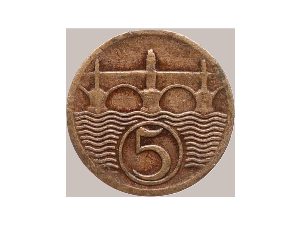 Tento 5haléř z roku 1930 je typickým příkladem drobné měny první Československé republiky, ražené v letech 1923–1938. Averz zobrazuje státní znak se slovenským křížem na hrudi českého lva a opisem REPUBLIKA ČESKOSLOVENSKÁ. Reverz nese vyobrazení Karlova mostu s vlnící se hladinou Vltavy a nominální hodnotou „5“. Tento design symbolizoval spojení historické Prahy s novým státem vzniklým po rozpadu Rakouska-Uherska. Mince je z mosazi (92 % Cu, 8 % Zn), váží 1,70 g, má průměr 16,2 mm a tloušťku 1 mm. Byla oficiálně vydána 10. srpna 1923 a z oběhu stažena 30. prosince 1942. Dnes je vyhledávaná nejen pro svou historickou hodnotu, ale i pro výrazný výtvarný motiv, který odkazuje na české kulturní dědictví.