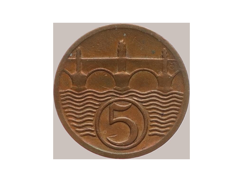 Tento 5haléř z roku 1930 je typickým příkladem drobné měny první Československé republiky, ražené v letech 1923–1938. Averz zobrazuje státní znak se slovenským křížem na hrudi českého lva a opisem REPUBLIKA ČESKOSLOVENSKÁ. Reverz nese vyobrazení Karlova mostu s vlnící se hladinou Vltavy a nominální hodnotou „5“. Tento design symbolizoval spojení historické Prahy s novým státem vzniklým po rozpadu Rakouska-Uherska. Mince je z mosazi (92 % Cu, 8 % Zn), váží 1,70 g, má průměr 16,2 mm a tloušťku 1 mm. Byla oficiálně vydána 10. srpna 1923 a z oběhu stažena 30. prosince 1942. Dnes je vyhledávaná nejen pro svou historickou hodnotu, ale i pro výrazný výtvarný motiv, který odkazuje na české kulturní dědictví.