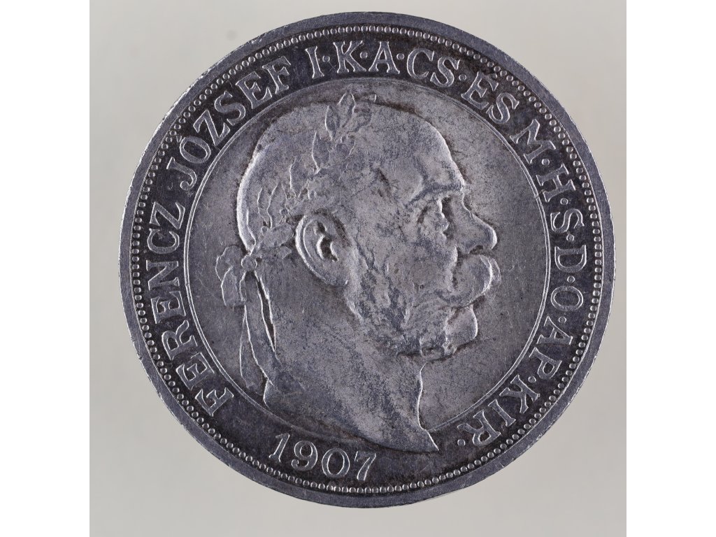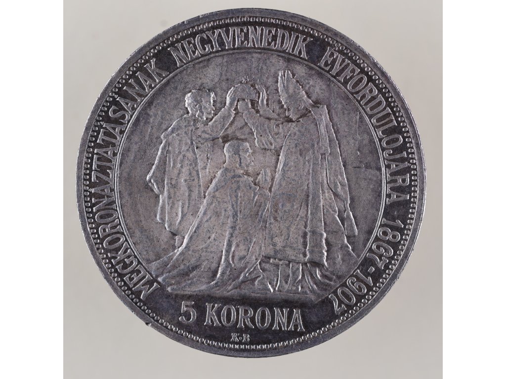 Stříbrná 5 korona z roku 1907 patří mezi nejznámější uherské pamětní mince období Františka Josefa I. Byla vydána ke 40. výročí jeho korunovace uherským králem (1867–1907). Averz zdobí důstojný portrét císaře s opisem FERENCZ JÓZSEF I·K·A·CS·ES·M·H·S·D·O·AP·KIR, symbolizující jeho vládu a tradici. Pod portrétem je umístěn letopočet 1907 a značka mincovny KB (Kremnica).