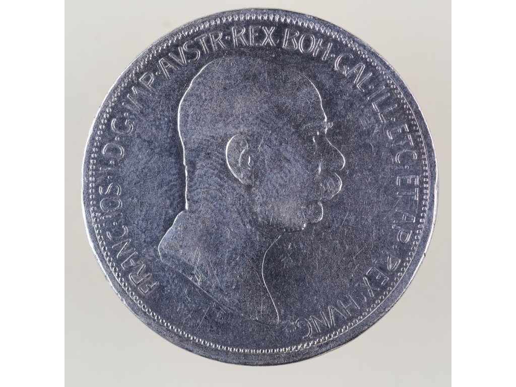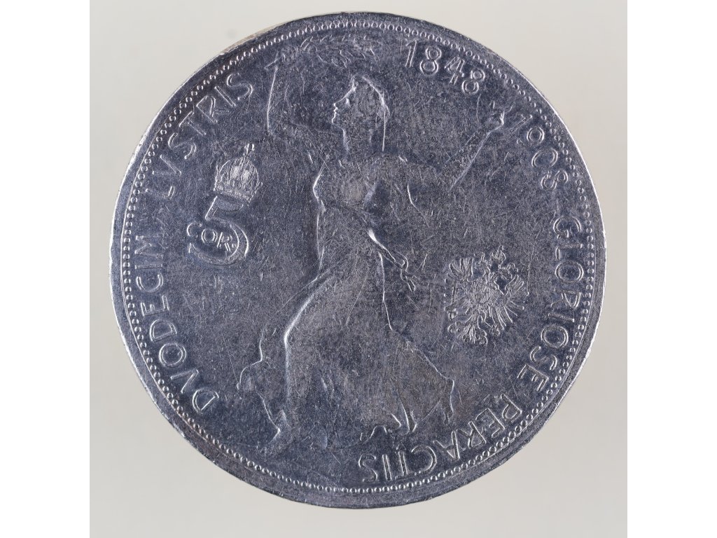 Jubilejní stříbrná 5 korona z roku 1908 připomíná významné 60. výročí nástupu Františka Josefa I. na trůn. Averz mince nese charakteristický portrét císaře s latinskou legendou FRANC·IOS·I·D·G·IMP·AVSTR·REX BOH·GAL·ILL·ETC·ET·AP·REX HVNG, která dokládá jeho vládní tituly v rakousko-uherské monarchii.