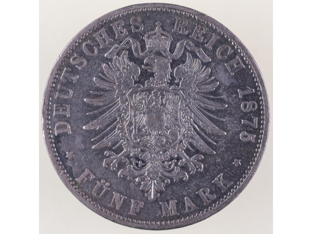 Na reverzu dominuje státní znak Německého císařství – korunovaný císařský orel se štítem, lemovaný nápisem DEUTSCHES REICH 1875 a nominální hodnotou FÜNF MARK. Tato emise patří mezi první pětimarkové stříbrné mince po sjednocení Německa v roce 1871, kdy vznikl nový měnový systém nahrazující dosavadní regionální měny jako tolary a guldeny.