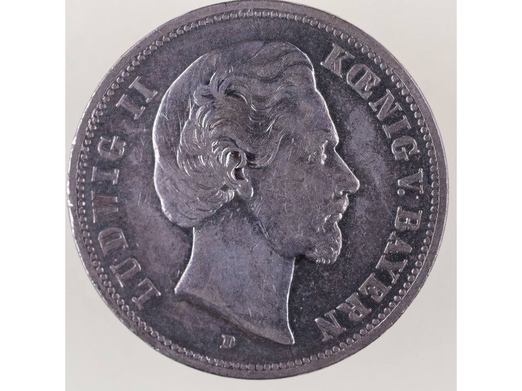 Tato stříbrná pětimarka z roku 1875 nese portrét Ludvíka II., krále bavorského, známého jako „pohádkový král“. Jeho vláda (1864–1886) je spojována s kulturním mecenášstvím a výstavbou honosných zámků, jako je slavný Neuschwanstein. Averz mince nese nápis LUDWIG II KOENIG V. BAYERN a ražební značku „D“, která označuje mincovnu v Mnichově.