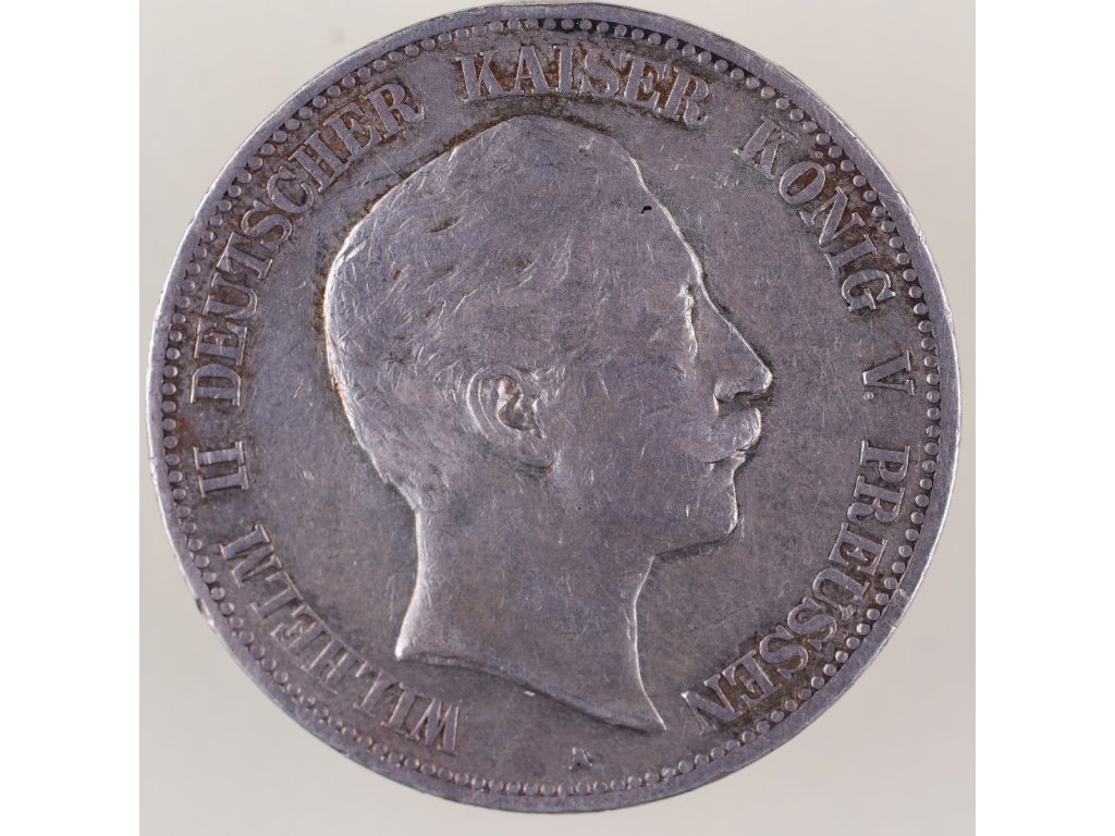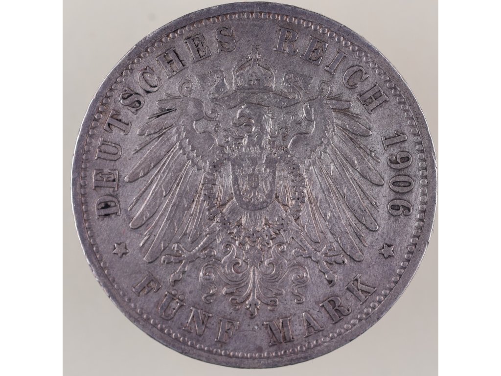 Tato stříbrná 5marka byla vyražena v roce 1906 za vlády německého císaře a pruského krále Viléma II. (1888–1918). Averz mince nese jeho portrét s nápisem WILHELM II DEUTSCHER KAISER KÖNIG V. PREUSSEN, zatímco reverz zdobí imperiální orel s korunou a středovým erbem, doplněný legendou DEUTSCHES REICH 1906 a nominální hodnotou FÜNF MARK. Ražební značka „A“ označuje Berlínskou mincovnu.