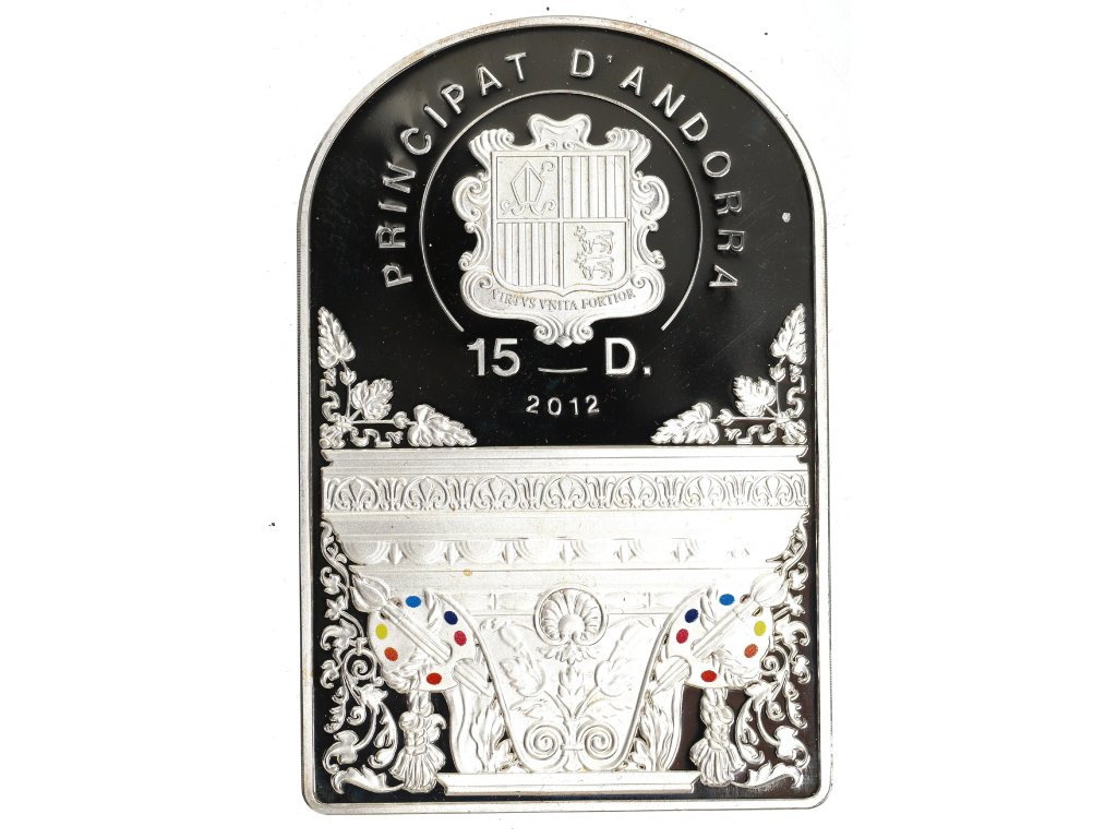 Averz nese kolorovanou scénu Botticelliho Madonny, orámovanou bohatě zdobeným renesančním motivem s figurálními sloupy. Reverz zobrazuje státní znak Andorry s legendou PRINCIPAT D’ANDORRA, nominální hodnotou 15 Diners a letopočtem 2012. Celek doplňuje dekorativní reliéf s paletami malíře jako symbolem uměleckého odkazu.