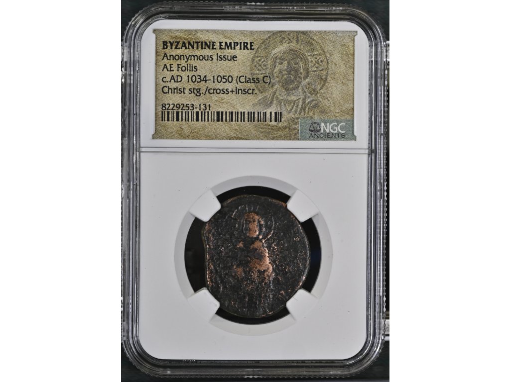 Anonymní follisy patří k charakteristickým emisím středně byzantského období. Vznikaly přibližně v 10. a 11. století, kdy se na měděných nominálech přestalo objevovat jméno aktuálního císaře a hlavním motivem se stal Kristus jako nejvyšší vládce a ochránce říše. Tento konkrétní typ je řazen do třídy C a datován přibližně do let 1034–1050.