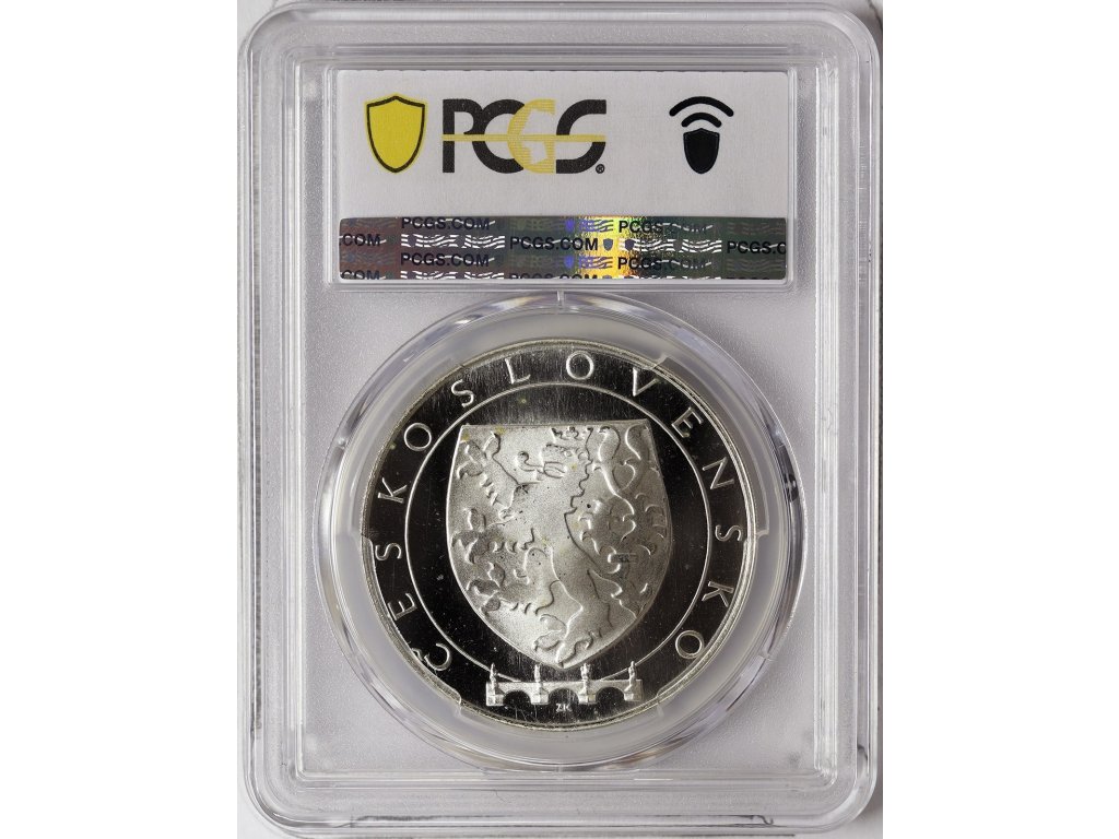 Exemplář je certifikován společností PCGS v mimořádné zachovalosti MS 68, což potvrzuje špičkový stav, vysokou kvalitu ražby a výborně dochovaný povrch. Díky tomu je medaile atraktivní jak pro sběratele československých pamětních ražeb, tak pro zájemce o moderní medailérství s historickým přesahem.