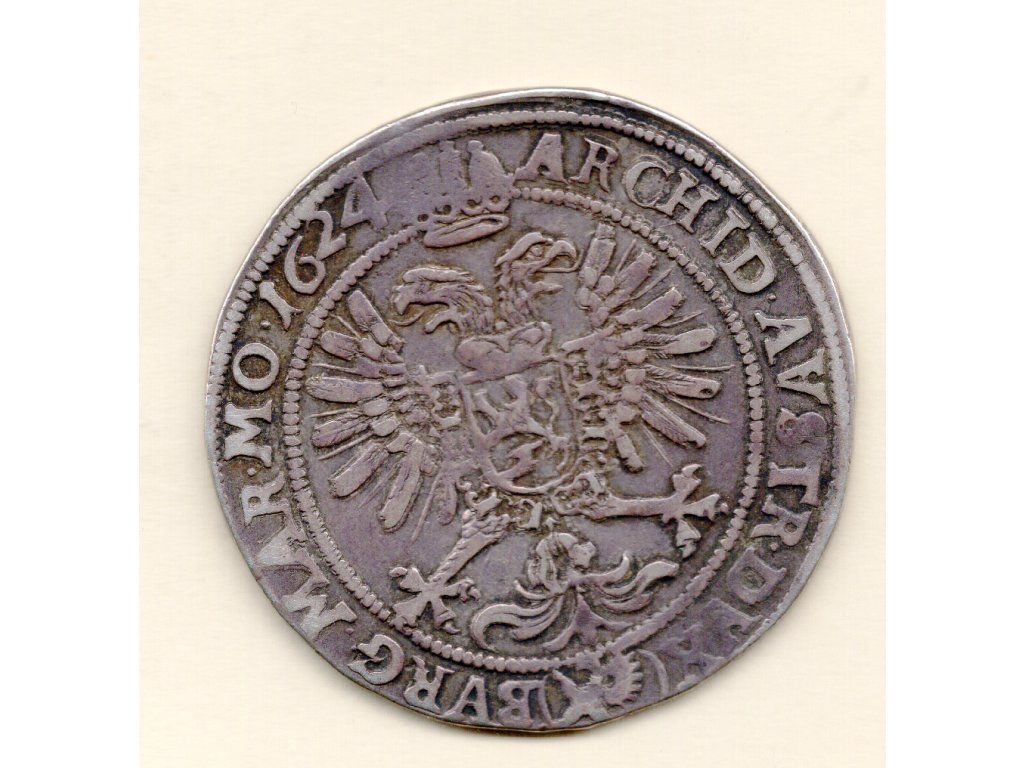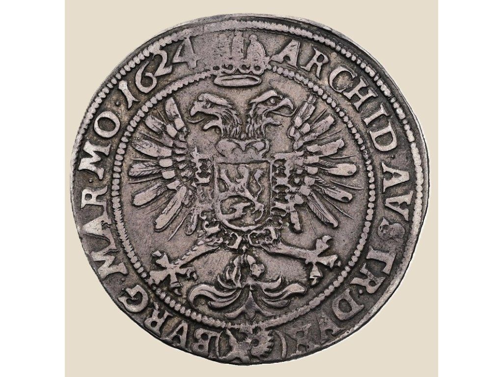 Půltolar z roku 1624, ražený v pražské mincovně, nese výrazný portrét císaře Ferdinanda II., jedné z klíčových postav Třicetileté války. Ferdinand II., císař Svaté říše římské a zarytý zastánce katolické víry, sehrál zásadní roli při potlačení stavovského povstání a následné rekatolizaci českých zemí. Mince s jeho vyobrazením sloužila nejen jako platidlo, ale i jako politický nástroj – výraz moci a legitimity Habsburků. Reverzní strana s korunovaným dvouhlavým orlem a štítem se znakem dynastie zdůrazňuje imperiální prestiž. Pražská mincovna byla v této době jedním z hlavních center ražby kvalitních mincí. Půltolary jsou vzácnější než celé tolary a vyhledávané sběrateli právě pro svůj menší výskyt a výtvarnou kvalitu.