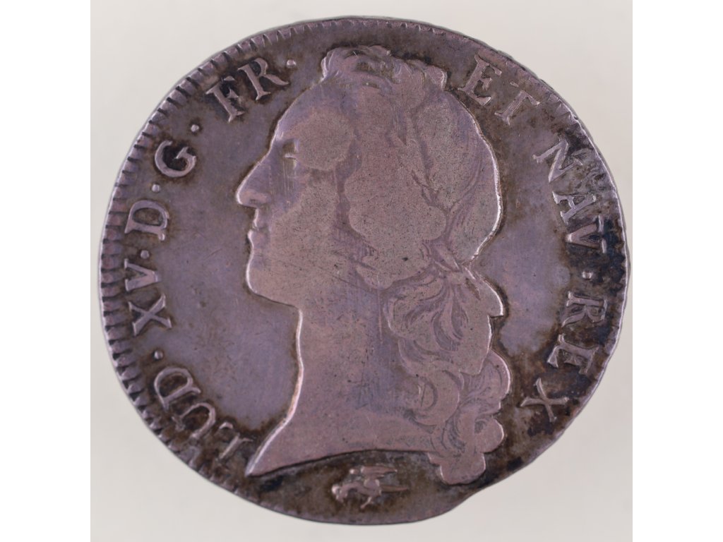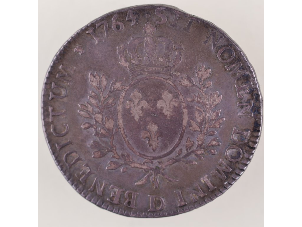 Écu z roku 1764, známý jako Écu aux bandeau, vznikl za vlády francouzského krále Ludvíka XV., který zemi vládl v letech 1715–1774. Mince představuje závěrečnou fázi jeho panování, kdy se francouzská monarchie dostávala pod rostoucí tlak společenských a hospodářských změn, jež později vyústily v revoluci. Averz mince zdobí portrét krále s čelenkou – stylizovanou stužkou uvázanou přes paruku – který byl novinkou ve francouzské numismatice a symbolizoval modernizující se dvůr. Reverz nese tradiční královský znak s liliemi a korunou, lemovaný větvemi oliv a palmy jako symboly míru a síly.