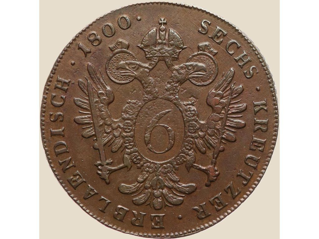 Mince Rakouského císařství o hodnotě šesti krejcarů z roku 1800 pochází z doby vlády císaře Františka II. (1792–1806), který byl zároveň posledním císařem Svaté říše římské a později prvním císařem Rakouska (František I.). Měna této éry odráží bouřlivé období napoleonských válek i snahu habsburské monarchie udržet ekonomickou stabilitu.