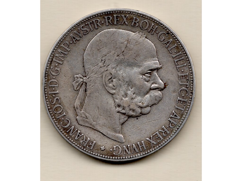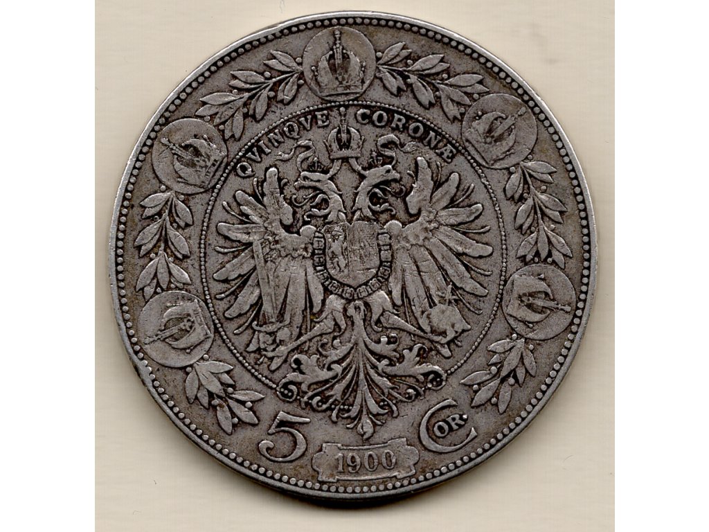 Stříbrná 5 korona z roku 1900 patří mezi nejatraktivnější mince habsburské éry. Averz zdobí výrazný portrét Františka Josefa I., doprovázený legendou FRANC·IOS·I·D·G·IMP·AVSTR·REX BOH·GAL·ILL·ETC·ET·AP·REX HVNG, která odkazuje na jeho tituly jako rakouského císaře a uherského krále. Tento motiv podtrhuje dlouhou a stabilní vládu, která charakterizovala konec 19. století.