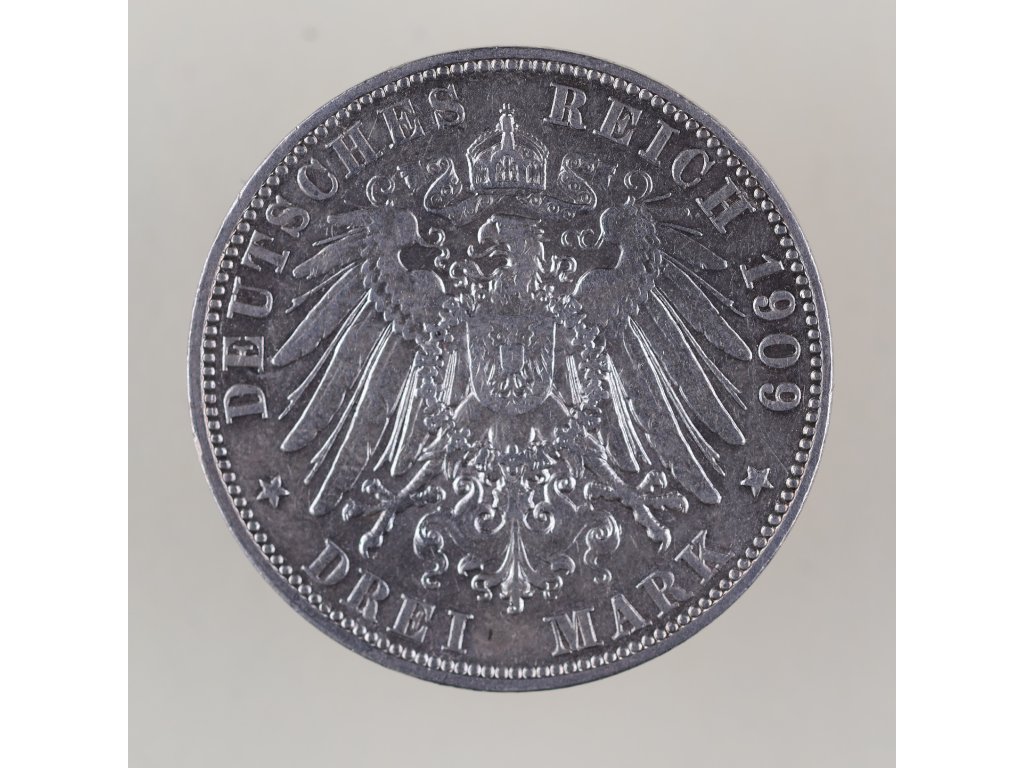 Na líci mince je vyobrazen portrét krále Fridricha Augusta III. s opisem FRIEDRICH AUGUST KÖNIG V. SACHSEN, zatímco na rubu se nachází korunovaný říšský orel s hodnotou DREI MARK a opisem DEUTSCHES REICH 1909. Mince byla ražena z kvalitního stříbra ryzosti 900/1000 v drážďanské mincovně, což potvrzuje značka „E“.