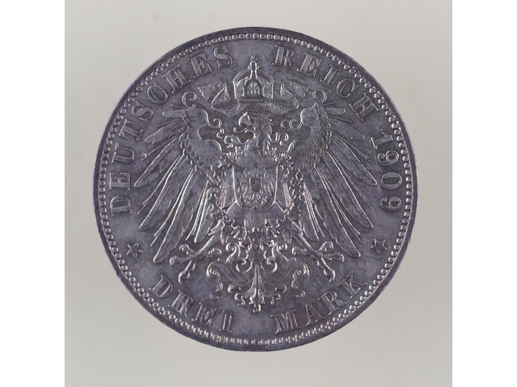 Na líci mince je vyobrazen portrét krále Fridricha Augusta III. s opisem FRIEDRICH AUGUST KÖNIG V. SACHSEN, zatímco na rubu se nachází korunovaný říšský orel s hodnotou DREI MARK a opisem DEUTSCHES REICH 1909. Mince byla ražena z kvalitního stříbra ryzosti 900/1000 v drážďanské mincovně, což potvrzuje značka „E“.