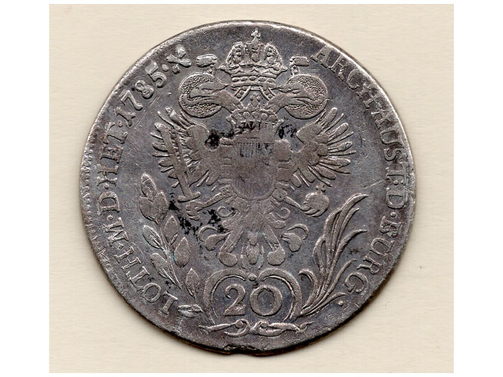 Nominál 20 krejcarů odpovídal jedné třetině tolaru a byl běžně používán v každodenním peněžním styku. Sloužil k úhradě menších i středních plateb a tvořil důležitý mezičlánek měnového systému založeného na guldenu a tolaru. Emise z roku 1785 spadá do pozdní fáze Josefovy vlády, kdy byly reformní zásahy již pevně zakotveny v praxi.