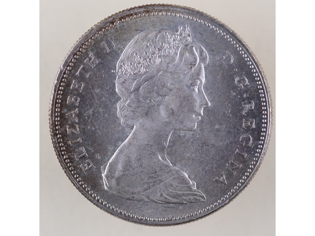 Alžběta II., královna Kanady a panovnice Commonwealthu, je vyobrazena na líci stříbrného dolaru z roku 1966. Její portrét zdůrazňuje kontinuitu monarchie a její spojení s moderním kanadským státem, který byl v této době již více než století součástí britského impéria a zároveň budoval vlastní národní identitu.