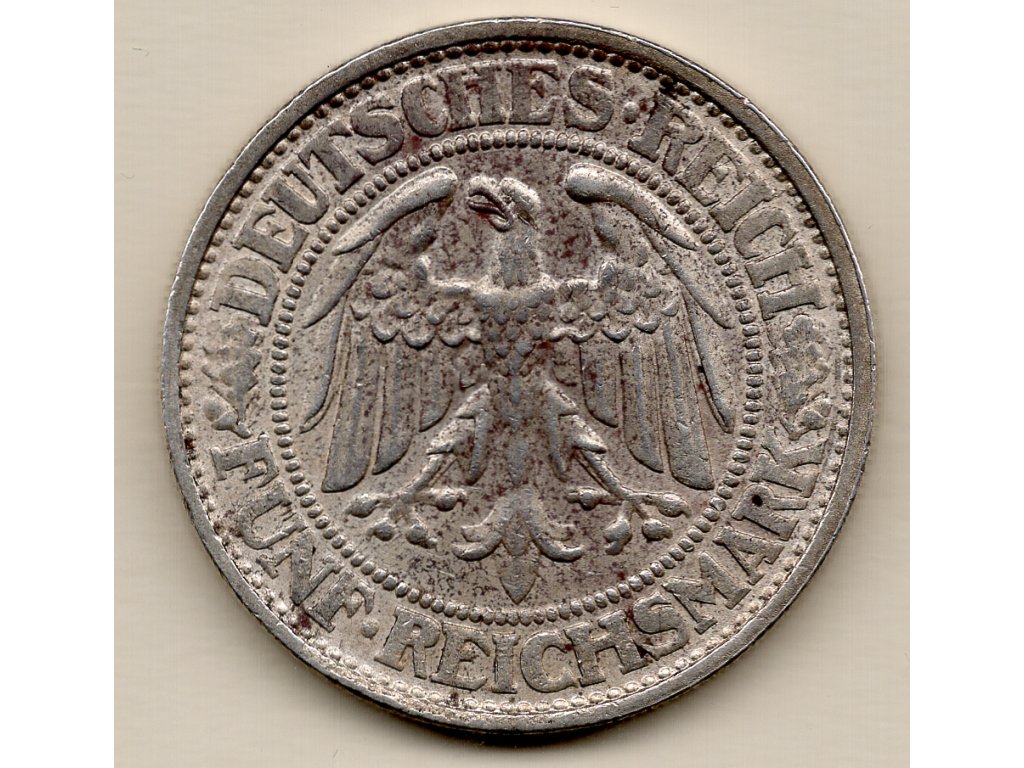 Tato stříbrná pětimarka byla ražena v roce 1932, tedy v závěrečné fázi Výmarské republiky, která vznikla po první světové válce a představovala první demokratický pokus v německých dějinách. Averz nese státní znak – říšského orla – s nápisem Deutsches Reich – Fünf Reichsmark, zatímco reverz zdobí mohutný dub, tradiční symbol síly a kontinuity německého národa. Nápis EINIGKEIT UND RECHT UND FREIHEIT vyjadřuje ideály republiky: jednotu, právo a svobodu.