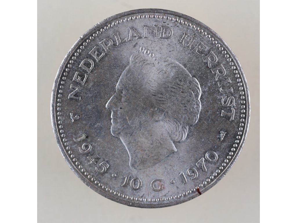 Na averzu je vyobrazen portrét královny Juliany, která vládla v letech 1948–1980 a hrála významnou roli v období poválečné modernizace země. Reverz pak zobrazuje letopočty 1945–1970 a nominální hodnotu 10 G. Mince byla určena k oběhu, ale díky své symbolice a složení z ryzího stříbra (720/1000) se stala i vyhledávaným sběratelským kusem.