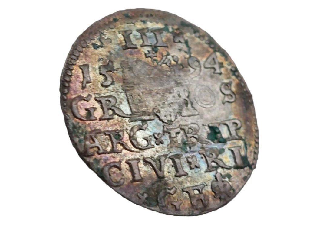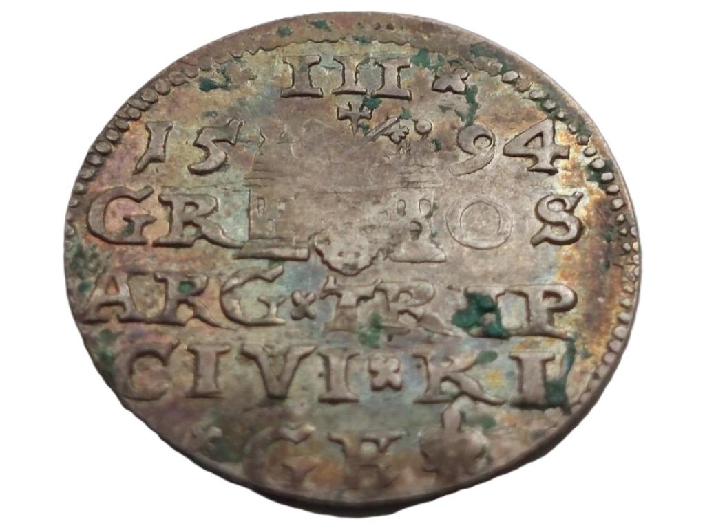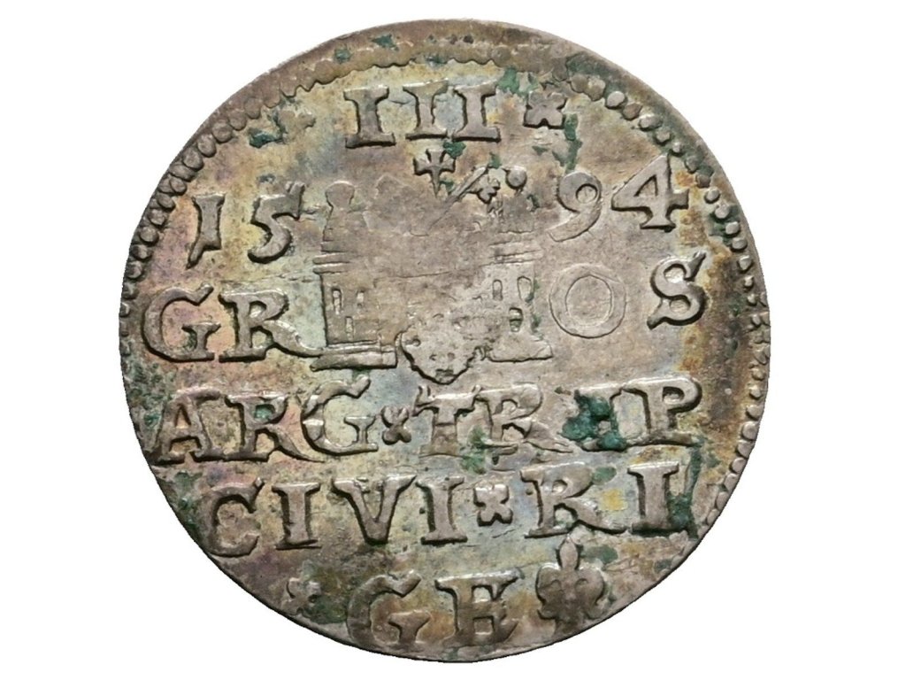 Tato stříbrná mince o nominální hodnotě 3 groše (trojak) byla vyražena v roce 1594 ve městě Riga, tehdy součásti Polsko-litevské unie. Na averzu je vyobrazen profilový portrét krále Zikmunda III. Vasy (1587–1632) s korunou a bohatě zdobeným límcem. Opis obsahuje jeho jméno a tituly.